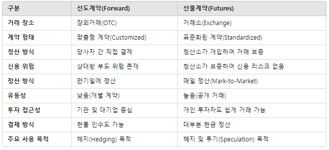 1️⃣ 선도계약(Forward)은 맞춤형(비표준화) & 장외거래(OTC), 선물계약(Futures)은 표준화 & 거래소 거래