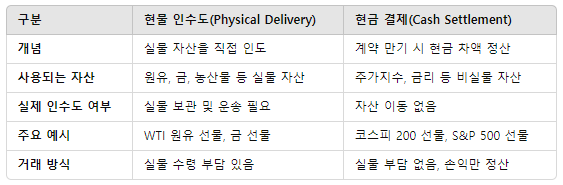 - 실물 자산(원유, 금, 농산물 등) → 현물 인수도 가능