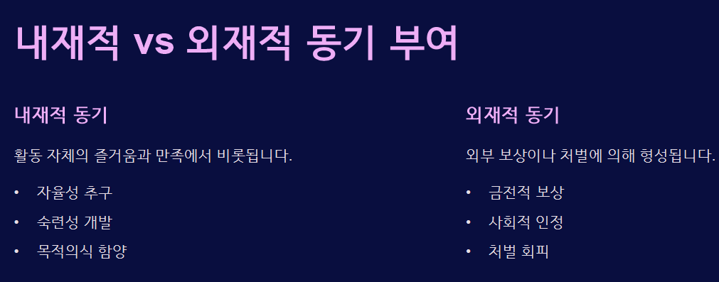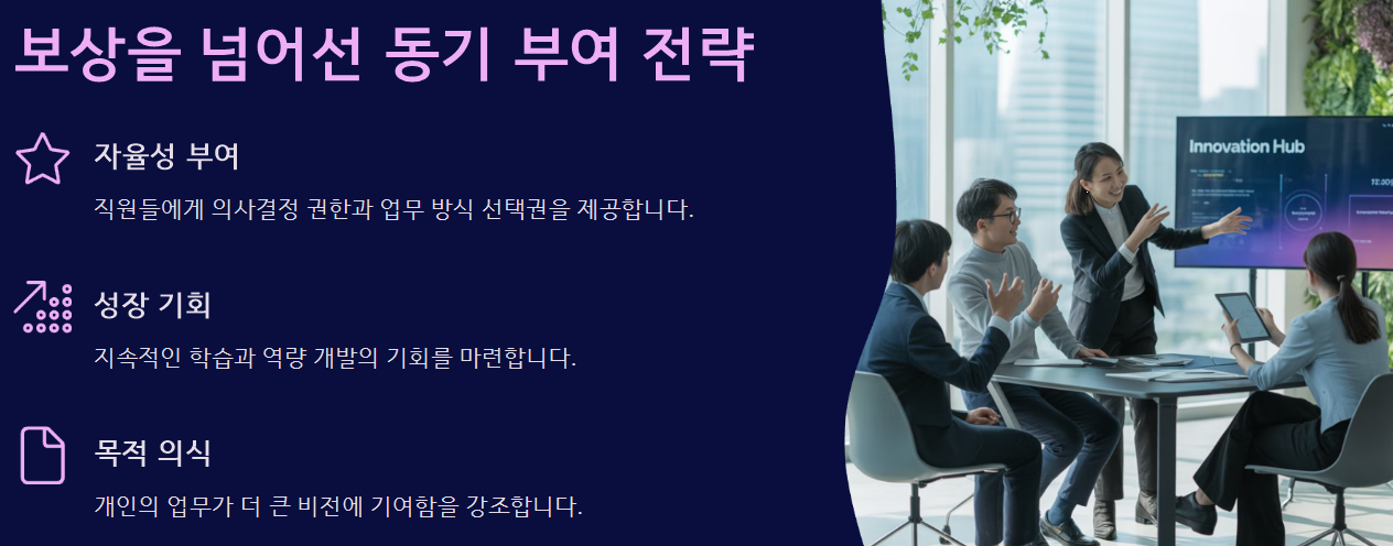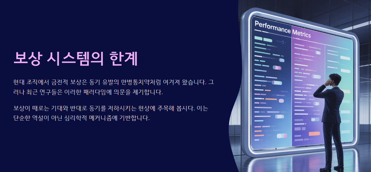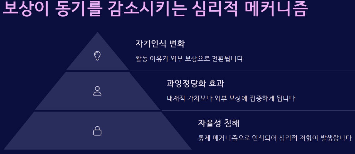 이는 단순한 '보상량'의 문제가 아닙니다. 인간은 심리적으로 외적 보상보다 내적 동기를 더 강하게 반응하는 구조를 갖고 있기 때문입니다. 특히 “자율성”, “도전감”, “의미”와 같은 요소들이 결여된 상태에서 보상은 오히려 동기를 저해하는 결과를 낳기도 합니다.
