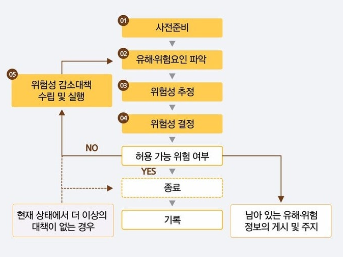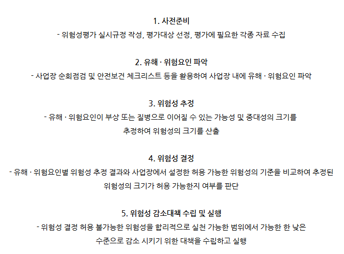산업현장에서 필수인 위험성평가 5단계 절차와 각 단계별 예시를 정리했습니다.