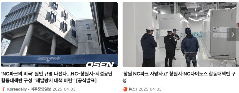 2025년 3월 29일, 창원 NC파크에서 발생한 구조물 추락 사고로 인해 20대 관람객이 사망하는 안타까운 사고가 발생했다. 이 사고의 정확한 원인 규명과 재발 방지 대책 마련을 위해 NC 다이노스, 창원시, 창원시설공단이 합동 대책반을 구성했다.