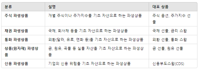 ✅ 기초 자산에 따라: 주식, 채권, 통화, 원자재, 신용