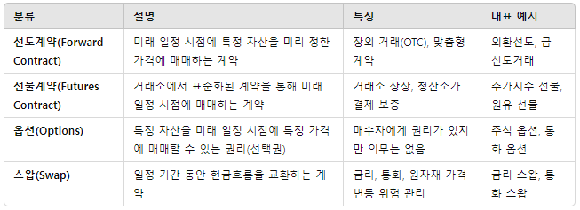✅ 계약 형태에 따라: 선도, 선물, 옵션, 스왑