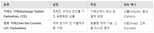 ✅ 거래 방식에 따라: 거래소 거래(선물, 옵션) vs 장외 거래(선도, 스왑)